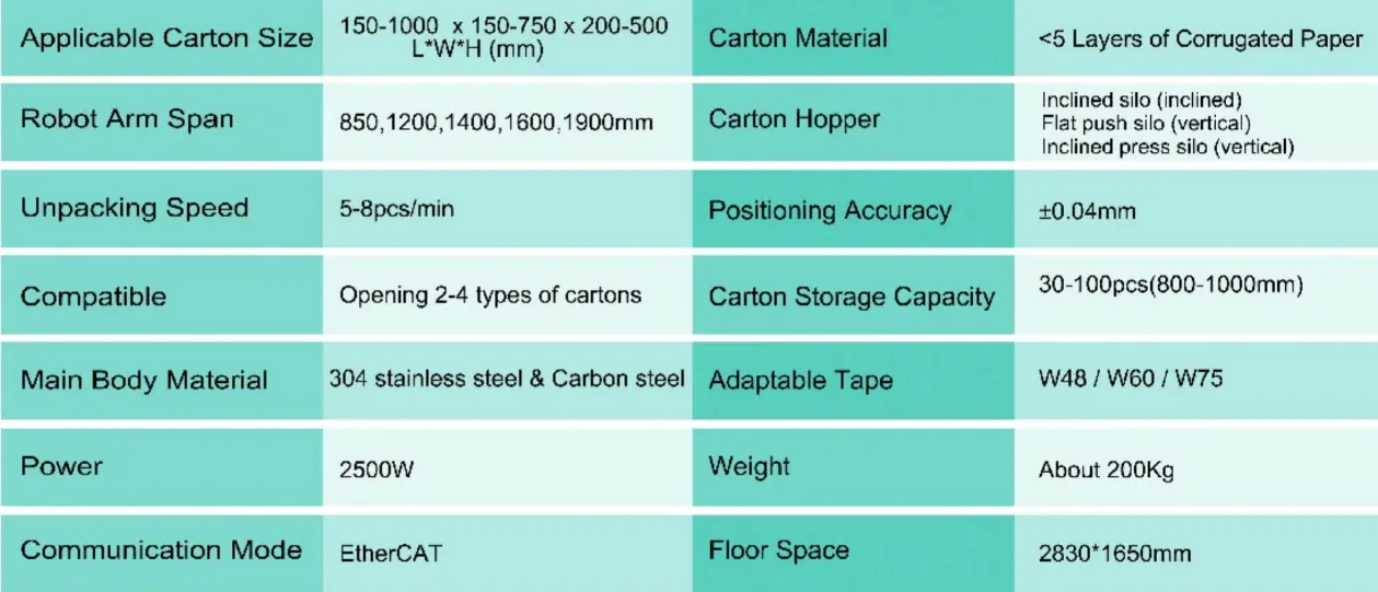 It supports multiple carton sizes with fast mechanical and software changeovers, making it ideal for flexible, high-mix production. Designed for seamless integration, the cell connects easily to conveyors, sealing machines, packing stations, and palletizing systems.